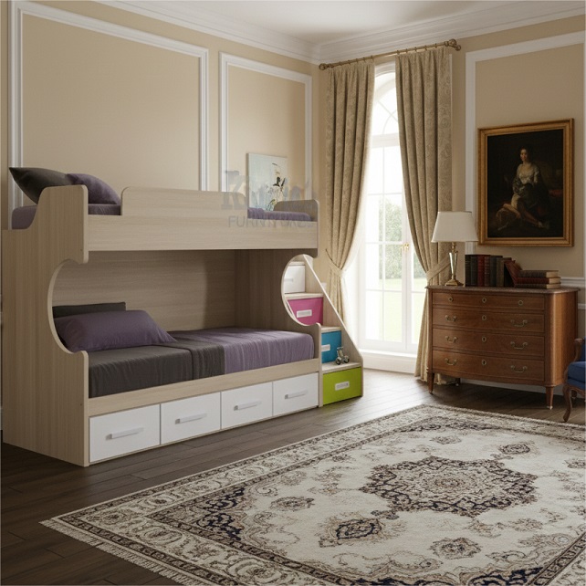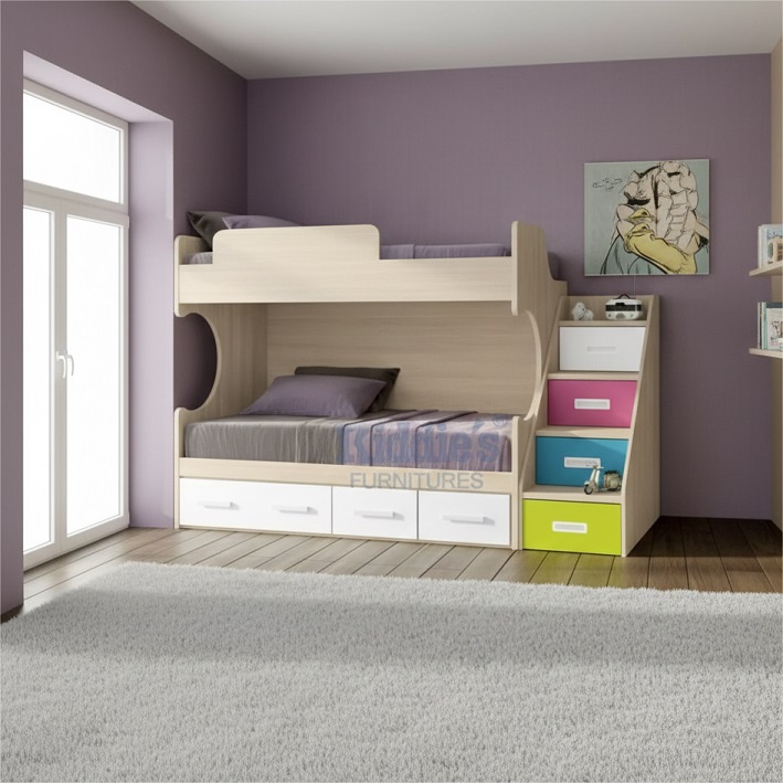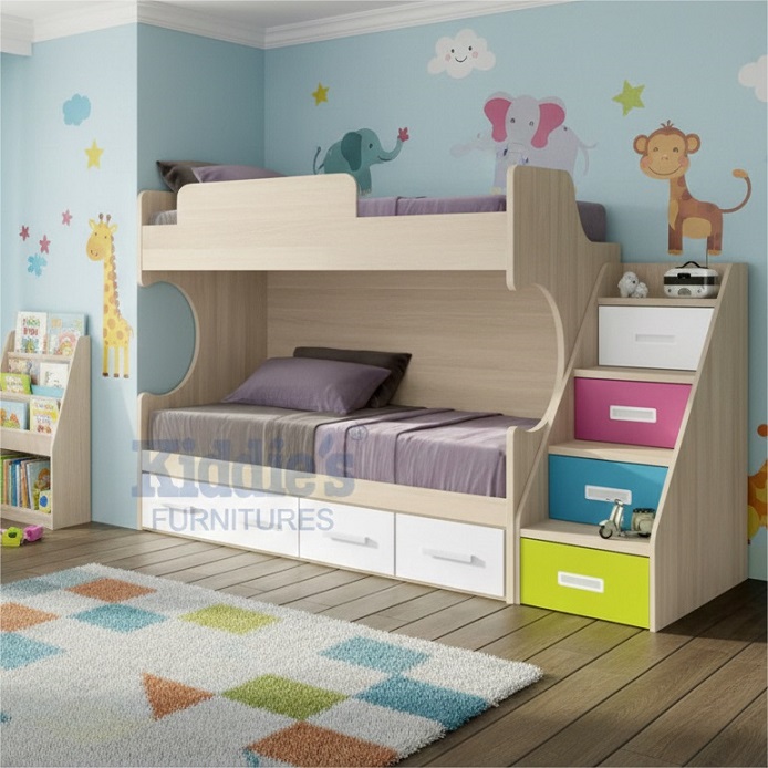 This bunk bed is a type of multiple bed in which the individual beds are arranged one above the other. This arrangement of beds is ideal to save space. Storage space is provided under the attractive staircase attached to the bed. Best quality and durable materials.